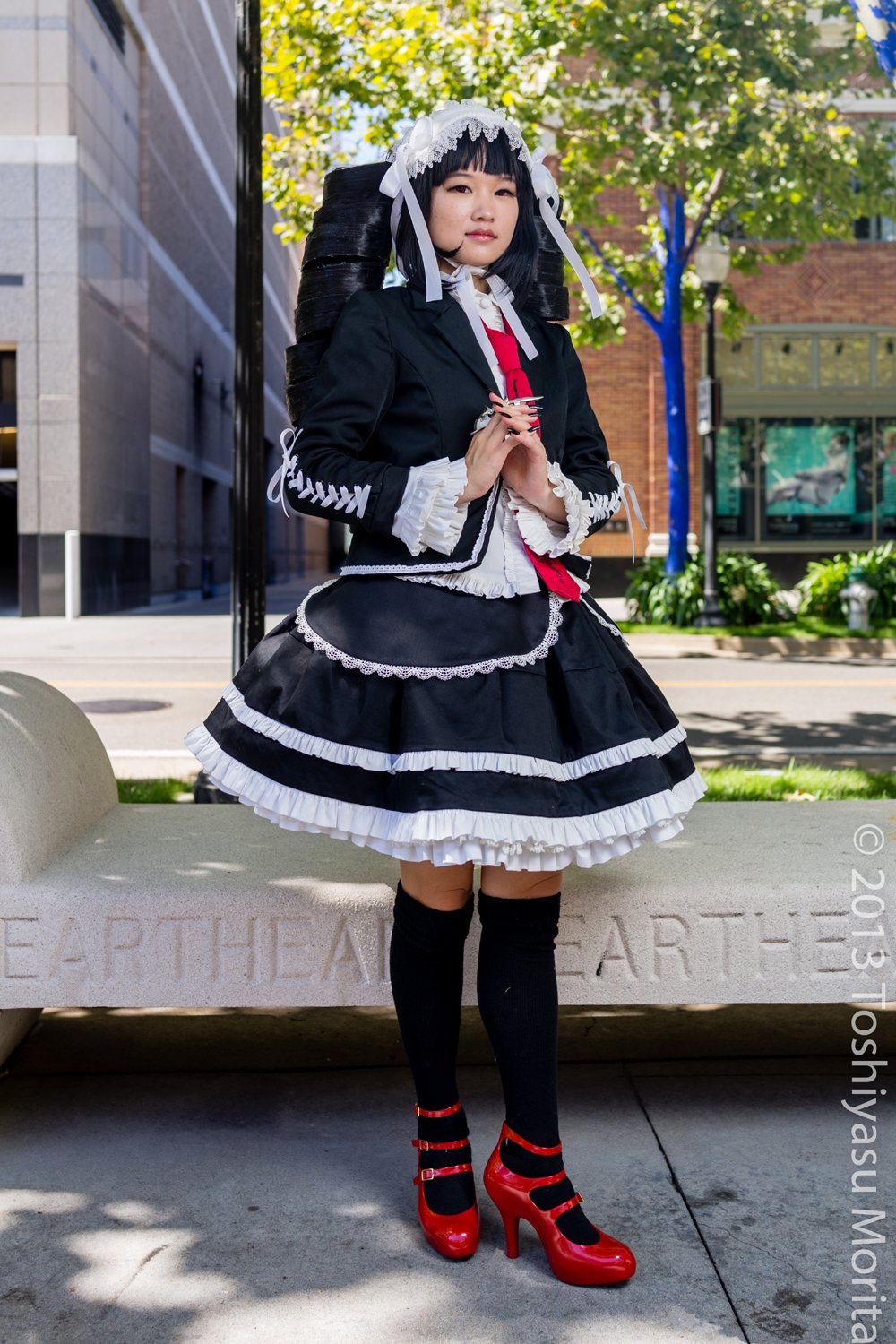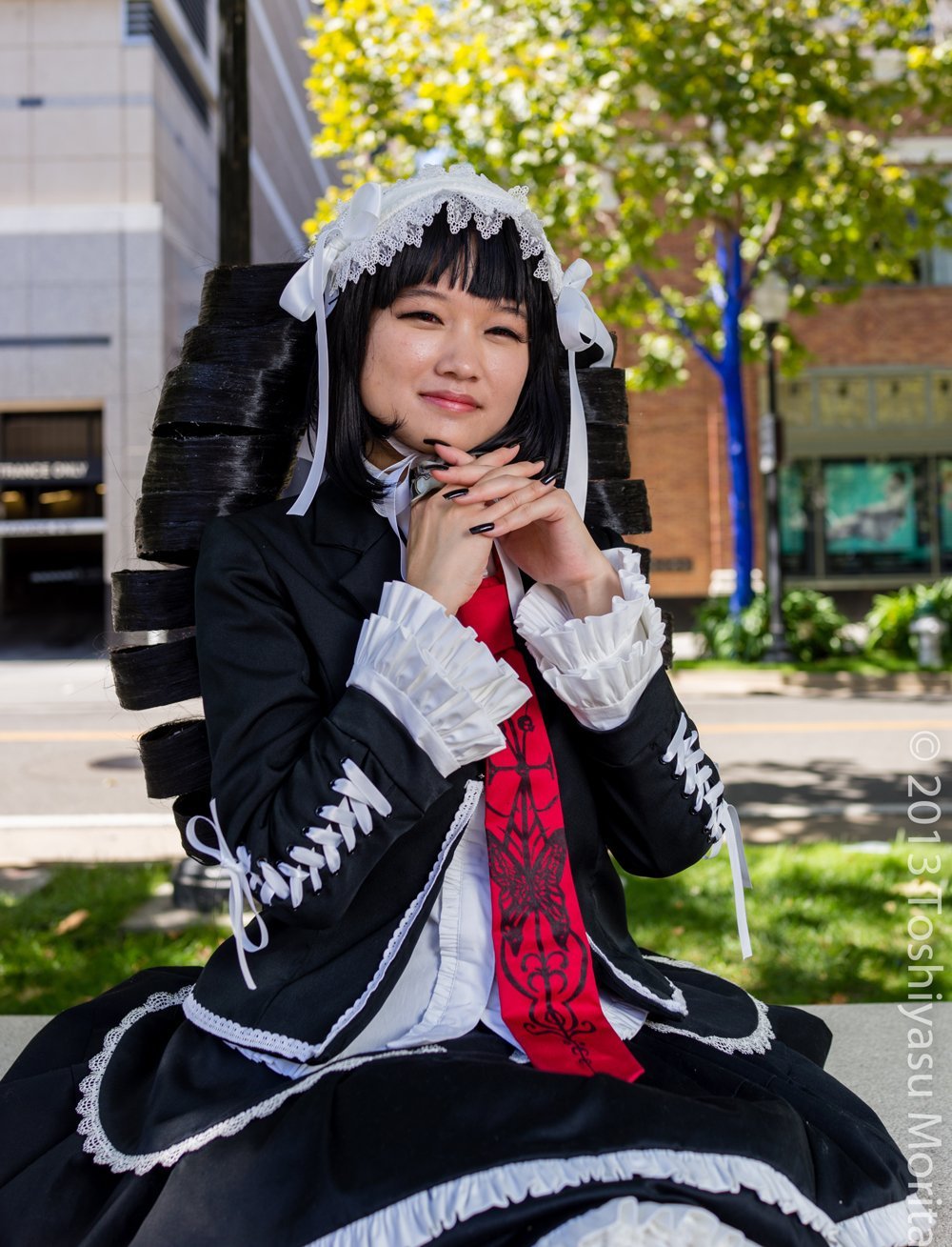 “This wig was very, very tedious to make and took over 12 hours of my time, but it was actually my first wig styling project that went beyond cutting bangs into shape! For the base, I trimmed the bangs down to a blunt cut and cut the back of the wig short. For the curls, I made two 150” long strips of wire (that’s 25 feet) sandwiched between pieces of black tape, and then laid down black wefts along both sides of each curl base using caulk to secure the hair down. I painted fabric glue on top to prevent any stray hairs from falling off, and then curled them both into giant drill curls, stitching them down with thread and needle to keep them in place. Then I just sewed the curls into my wig and it was good to go! Despite how huge it is, this wig is actually extremely comfortable to wear.