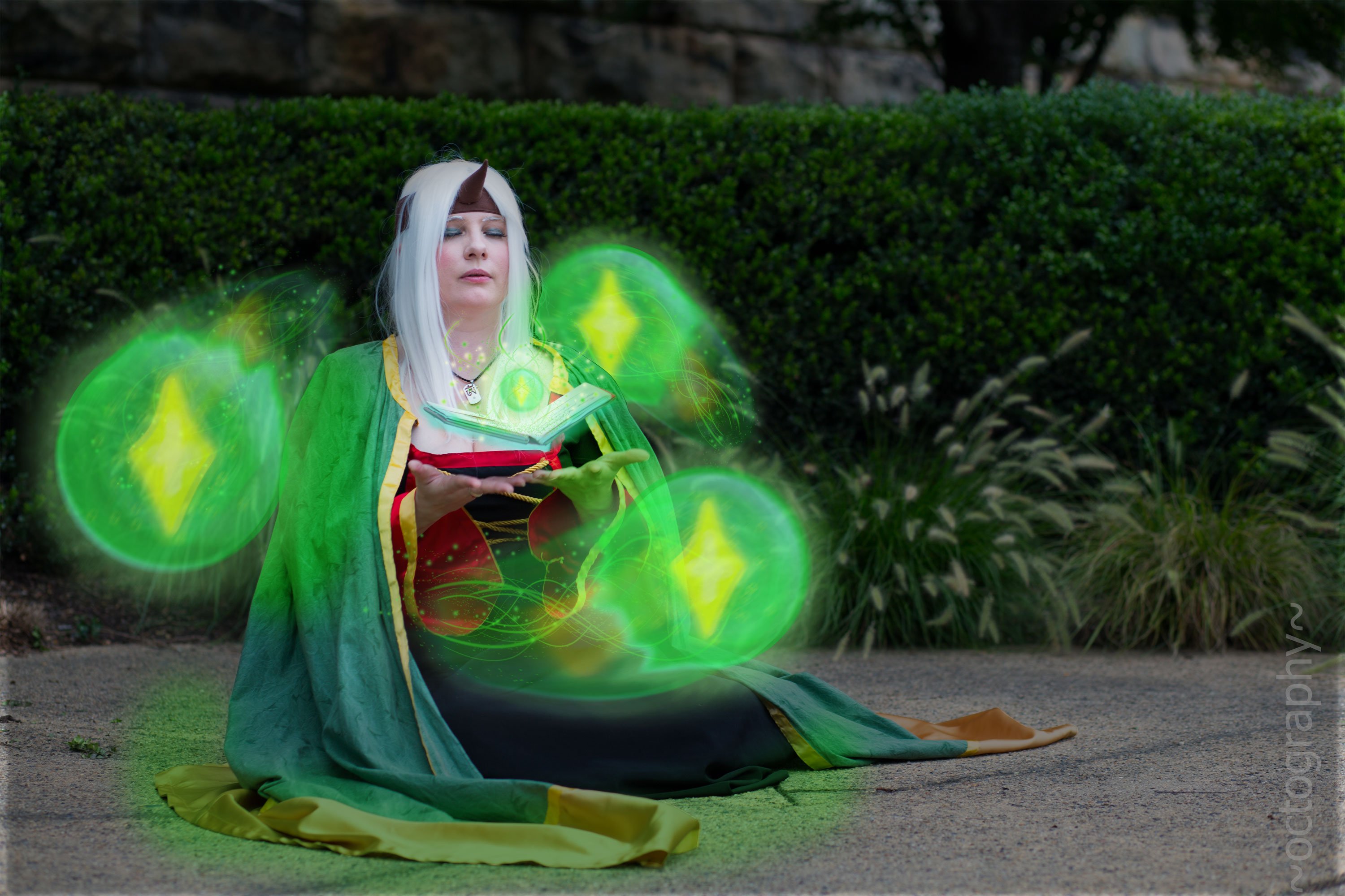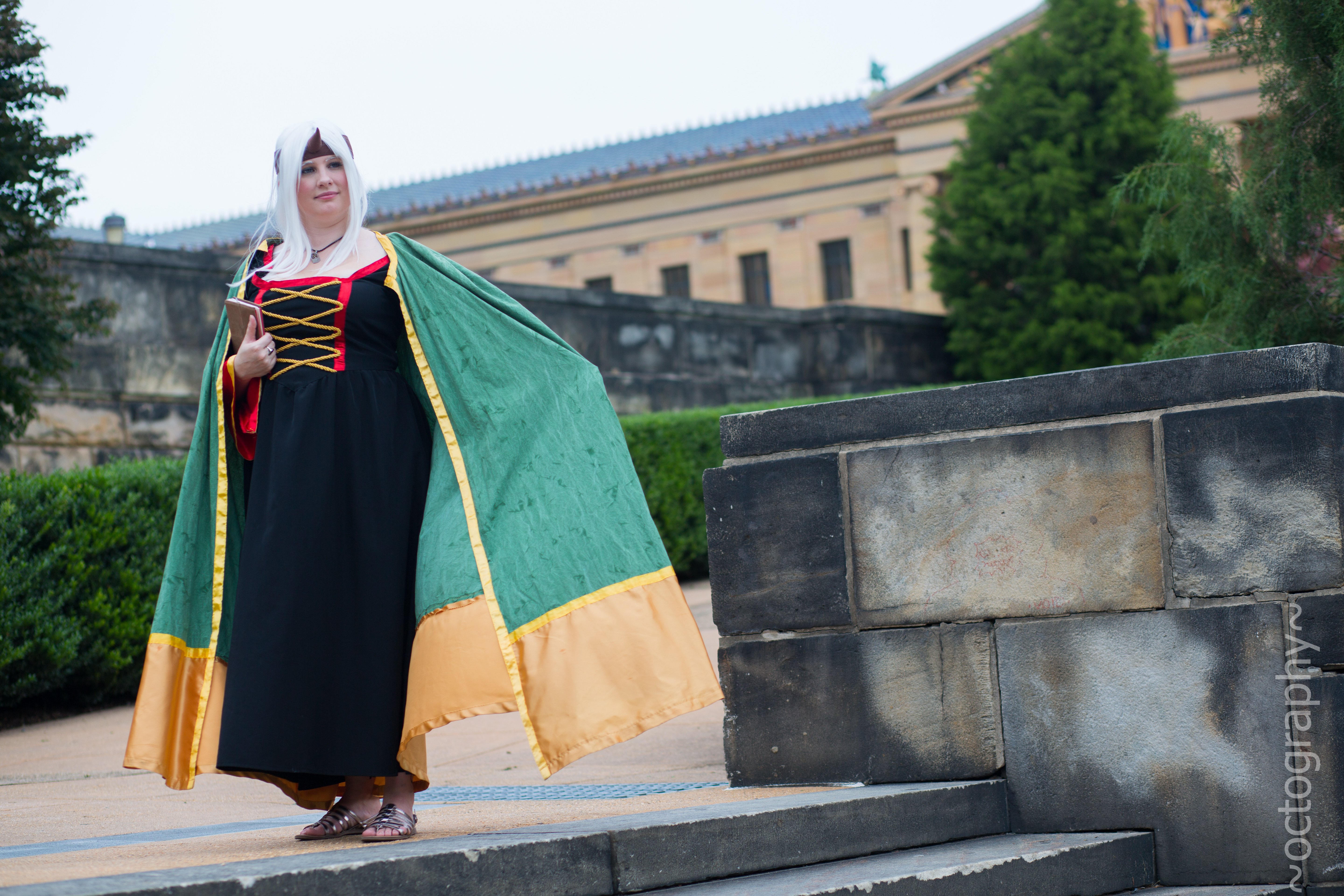 “Wig was made into long braided tail in the back that is tied with yellow ribbon. Bangs were cut and razored to help frame face and move around the horn. The braid keeps well in its shape without needing to be untied for care, but the bangs constantly need brushing due to its constant friction against my costume and skin.”